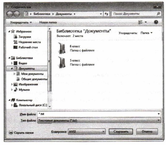 1. Откройте текстовый редактор Блокнот. 2. Наберите текст: БЛОКНОТ - ПРОСТОЙ ТЕКСТОВЫЙ РЕДАКТОР. 3. Выполните команду Файл—Сохранить как. Убедитесь, что в рабочей области окна Сохранить как представлено содержимое библиотеки Документы.