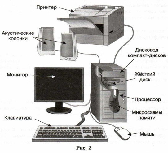 § 2. Компьютер — универсальная машина для работы с информацией Как устроен компьютерГлавным в компьютере является системный блок, включающий в себя процессор, устройства оперативной памяти (микросхемы памяти), жёсткий диск, блок питания и др. (рис. 2).