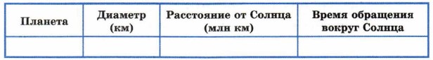 Расстояние от Юпитера до Солнца — 778 млн км. Расстояние от Урана до Солнца — 2870 млн км. Диаметр планеты Юпитер — 142 800 км. Диаметр планеты Сатурн — 120 860 км. Расстояние от Сатурна до Солнца — 1 427 млн км. Диаметр планеты Уран — 52 000 км. Расстояние от Земли до Солнца — 150 млн км. Диаметр планеты Меркурий — 4880 км. Расстояние от Нептуна до Солнца — 4497 млн км. Время обращения Сатурна вокруг Солнца — 29,5 лет. Расстояние от Марса до Солнца — 228 млн км. Диаметр планеты Нептун — 48 400 км. Время обращения Урана вокруг Солнца — 84 года. Время обращения Нептуна вокруг Солнца — 165 лет. Время обращения Юпитера вокруг Солнца — 12 лет. Расстояние от Меркурия до Солнца — 58 млн км. Время обращения Земли вокруг Солнца — 365 дней. Время обращения Меркурия вокруг Солнца — 88 дней. Диаметр планеты Марс — 6790 км. Время обращения Венеры вокруг Солнца — 225 дней. Диаметр планеты Земля — 12 756 км. Диаметр планеты Венера — 12 100 км. Расстояние от Венеры до Солнца — 108 млн км. Время обращения Марса вокруг Солнца — 687 дней.