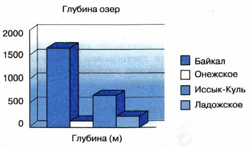 Появится столбчатая диаграмма, показывающая глубину перечисленных озёр, а также ещё одна таблица с исходными данными.