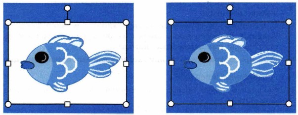 8. Вставьте на пустой слайд рисунок Фон , созданный в программе Paint . Для этого выполните команду Вставка—Рисунок (вкладка Вставка ), найдите нужный файл в личной папке, выделите его и щёлкните на кнопке Вставить . Фоновый рисунок появится в рабочем поле (на слайде) программы PowerPoint . 9. На этот же слайд поместите изображения рыбки (файл Рыбка в личной папке) и осьминога файл Осьминог из папки Заготовки . 10. Рыбка и осьминог появились на экране на белом фоне (в белых прямоугольниках). Для того чтобы сделать фон прозрачным, выделите рыбку, щёлкнув на её изображении, — вокруг рыбки должна появиться рамка с маркерами.