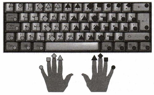 На клавиши с буквами «А» и «О» нанесены выпуклые риски. Это позволяет безошибочно найти соответствующие клавиши даже с закрытыми глазами. При вводе информации с помощью клавиатуры старайтесь придерживаться следующих рекомендаций. Удары пальцев по клавишам должны быть чёткими, отрывистыми и ритмичными. Ударяющий по клавише палец не должен прогибаться, а другие пальцы не должны подниматься со своих мест. После удара по любой клавише зоны «ответственности» палец должен возвращаться на своё основное место. Если вы почувствуете напряжение или усталость, то сделайте в работе небольшой перерыв. Чтобы освоить расположение клавиш, желательно поработать со специальной программой — клавиатурным тренажёром.