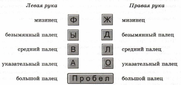 Для того чтобы печатать слепым десятипальцевым методом на символьной части клавиатуры, необходимо постоянно держать руки в одной и той же позиции, обеспечивающей возможность движения каждого пальца вслепую к клавишам своей зоны. Это расположение пальцев называют основной позицией. В основной позиции: