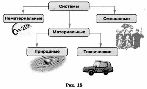 Любой реальный объект достаточно сложен. Поэтому его можно рассматривать как систему. Различают материальные, нематериальные и смешанные системы. В свою очередь, материальные системы разделяют на природные и технические (рис. 15).