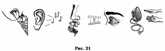 § 7. Как мы познаем окружающий мир Чувственное познание окружающего мираС первых минут жизни человек воспринимает реальную действительность, или окружающий мир (тепло, холод, звуки, свет и другие его проявления). Все окружающие нас объекты воздействуют на наши органы чувств. Органы чувств человека — средства приёма сигналов из внешнего мира для передачи их в мозг (рис. 21).