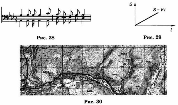 Какие действия могут быть выполнены только с оригиналом? 7. В какой ситуации искусственные цветы и муляжи фруктов могут использоваться в качестве моделей-«заместителей» настоящих цветов и фруктов? Какие свойства и отношения объектов отражают эти модели, а какие — нет? 8. Назовите объекты, модели которых приведены на рис. 28-30.