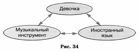 В соответствующей таблице типа ООО в каждой строке и каждом столбце будет находиться только одна 1, фиксирующая наличие связи между объектами. Это свойство можно использовать при решении логических задач. Пример 7 Маша, Оля, Лена и Валя — замечательные девочки. Каждая из них играет на каком-нибудь музыкальном инструменте и говорит на одном из иностранных языков. Инструменты и языки у них разные. Маша играет на рояле. Девочка, которая говорит по-французски, играет на скрипке. Оля играет на виолончели. Маша не знает итальянского языка, а Оля не владеет английским. Лена не играет на арфе, а виолончелистка не говорит по-итальянски. Нужно определить, на каком инструменте играет каждая из девочек и каким иностранным языком она владеет. В задаче рассматриваются объекты классов «девочка» (объекты с именами «Маша», «Оля», «Лена» и «Валя»), «музыкальный инструмент» («рояль», «скрипка», «виолончель», «арфа») и «иностранный язык» («французский», «немецкий», «английский», «итальянский»). Пары образуются из объектов классов «девочка» — «музыкальный инструмент», «девочка» — «иностранный язык», «музыкальный инструмент» — «иностранный язык», причем между объектами этих классов существует взаимно однозначное соответствие (рис. 34).
