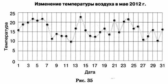 § 12. Графики и диаграммы Наглядное представление процессов изменения величинНа графике изображают две координатные оси под прямым углом друг к другу. Эти оси являются шкалами, на которых откладывают представляемые значения. Одна величина является зависимой от другой — независимой. Значения независимой величины обычно откладывают на горизонтальной оси (оси ОХ, или оси абсцисс), а зависимой величины — на вертикальной (оси OY, или оси ординат). При изменении независимой величины меняется зависимая величина. Например, температура воздуха (зависимая величина) может изменяться во времени (независимая величина). Таким образом, график показывает, что происходит с у при изменении х. На графике значения изображаются в виде кривых, точек или того и другого одновременно. График позволяет отслеживать динамику изменения данных. Например, по данным, содержащимся во 2-м столбце таблицы 13, можно построить график изменения температуры в течение рассматриваемого месяца. По графику можно мгновенно установить самый тёплый день месяца, самый холодный день месяца, быстро подсчитать количество дней, когда температура воздуха превышала двадцатиградусный рубеж или была в районе +15° С. Также можно указать периоды, когда температура воздуха была достаточно стабильна или, наоборот, претерпевала значительные колебания (рис. 35).