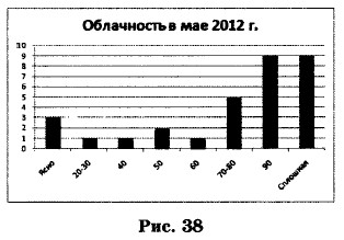 Столбчатые диаграммы состоят из параллельных прямоугольников (столбиков) одинаковой ширины. Каждый столбик показывает один тип качественных данных (например, один тип облачности) и привязан к некоторой опорной точке горизонтальной оси — оси категорий. В нашем случае опорные точки на оси категорий — это фиксированные значения облачности. Высота столбиков пропорциональна значениям сравниваемых величин (например, количеству дней той или иной облачности). Соответствующие значения откладываются на вертикальной оси значений. Ни ось значений, ни столбики не должны иметь разрывов: диаграмму используют для более наглядного сравнения, и наличие разрывов уничтожает саму цель представления результатов в виде диаграммы. По диаграмме на рис. 38 можно не только сравнить количество дней с той или иной облачностью, но и точно указать, сколько дней какой облачности было в течение рассматриваемого периода.