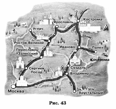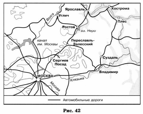 Уменьшенное обобщённое изображение поверхности Земли на плоскости в той или иной системе условных обозначений даёт нам географическая карта. На карте (рис. 42) изображён внешний вид территории северо-восточной части Центральной России. На ней показаны древние русские города, образующие знаменитое на весь мир Золотое кольцо.
