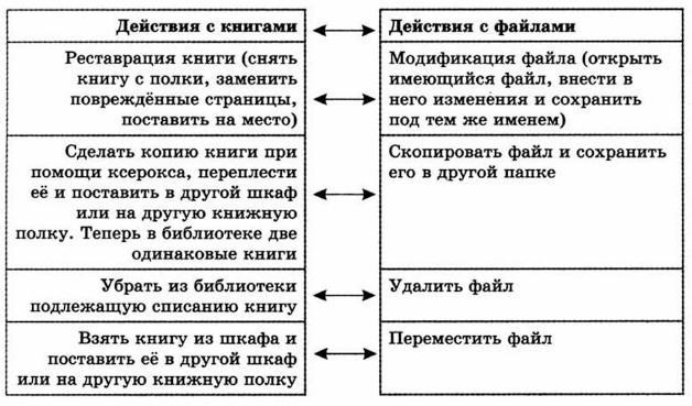 Во время работы на компьютере с файлами и папками чаще всего проводятся такие действия (операции), как модификация, копирование, удаление и перемещение. Здесь также можно провести аналогию с книгами в библиотеке: