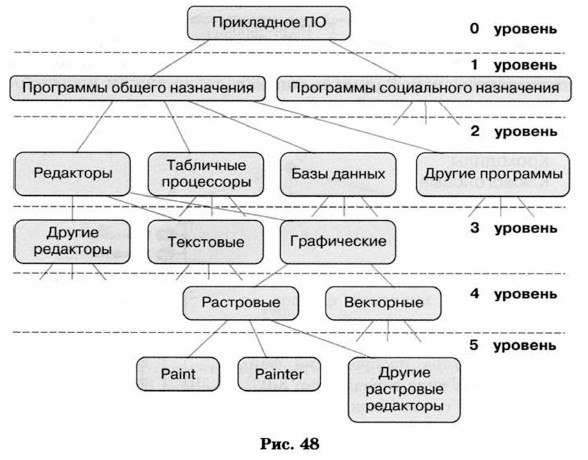 Например, иерархическую структуру имеет школа, потому что в ней установлены следующие отношения подчинённости: директор — заместители директора — учителя — ученики. Иерархическую структуру имеют системы, элементы которых связаны отношением «входит в состав». На рисунке 48 изображён граф иерархической системы, представляющий состав прикладного программного обеспечения (ПО) компьютера.