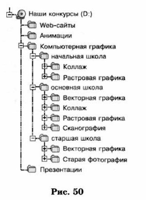 Иерархию легко изобразить «лесенкой» — в виде многоуровневого списка. Объекты одного уровня иерархии располагаются на одном уровне в списке. Чем ниже уровень иерархии, тем правее находится соответствующий уровень списка: Рептилии Черепахи Крокодилы Клювоголовые Чешуйчатые Ящерицы Змеи По иерархическому принципу организована система хранения файлов во внешней памяти компьютера. Операционная система позволяет получить на экране компьютера изображение файловой системы в виде дерева (рис. 50).