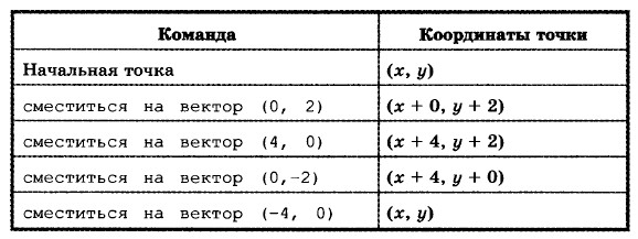 Чтобы изобразить отрезок АВ, воспользуемся командой сместиться на вектор (0, 2). В результате Чертёжник сдвинет перо из точки с координатами (х, у) в точку с координатами (х + О, у + 2). По команде сместиться на вектор (4, 0) перо окажется в точке (х + 4, у + 2). Чтобы из этой точки перейти в точку (х + 4, у + 0), следует выполнить команду сместиться на вектор (0, -2). По команде сместиться на вектор (-4, 0) перо Чертёжника прочертит отрезок к точке А: