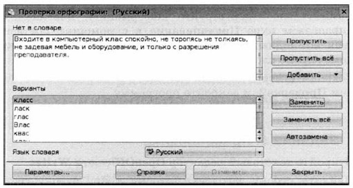 4. Обратите внимание на то, что некоторые слова и предложения подчеркнуты красными и зелёными волнистыми линиями. Красная линия говорит о том, что в слове, скорее всего, допущена ошибка или же его нет в компьютерном словаре. Зелёная линия подсказывает, что в предложении неверно расставлены знаки препинания. Попытайтесь самостоятельно устранить выявленные текстовым процессором ошибки. 5. Сохраните исправленный документ в личной папке под именем Проверка1. 6. Повторно откройте документ Ошибка.doc. 7. Запустите проверку документа с помощью команды Правописание (кнопка 8. Внимательно анализируйте информацию, появляющуюся в диалоговом окне Правописание и с помощью соответствующих командных кнопок вносите изменения или пропускайте помеченные слова. 9. Сохраните исправленный документ в личной папке под именем Проверка2 и закройте программу. Правописание