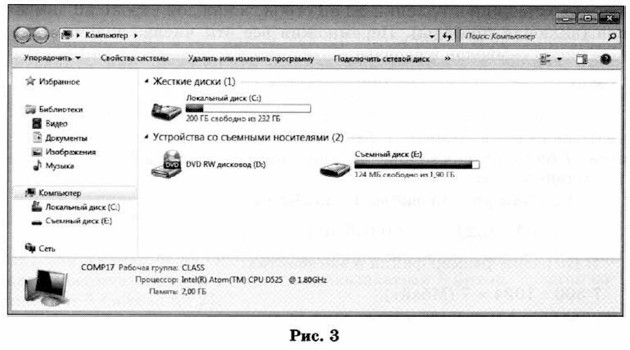 § 2. Компьютерные объекты Объекты операционной системыВам хорошо известны такие объекты операционной системы, как рабочий стол, панель задач, окна документов, папок, приложений и т. д. Все объекты, с которыми работает компьютер (программы, документы, папки, диски и т. д.), изображаются на экране небольшими картинками — значками. Описания этих объектов легко получить с помощью контекстного меню, которое открывается щелчком правой кнопкой мыши. В контекстном меню приведены все действия, которые можно выполнить с объектом. Например, документ можно открыть, проверить на вирусы, переименовать, скопировать, отправить по почте, удалить. Последний пункт контекстного меню любого объекта называется Свойства. С его помощью можно не только узнать свойства объекта, но и изменить некоторые из них. Рассмотрим одно из средств, позволяющих увидеть, какие файлы хранятся в компьютере. Окно Компьютер (Мой компьютер) содержит значки всех устройств компьютера, на которых можно хранить файлы (рис. 3).