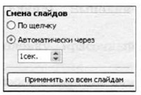 5. Выполните команду Демонстрация — Смена слайда. В открывшемся окне отметьте флажком режим Автоматически после и установите время 1 сек. Щёлкните на кнопке Применить ко всем слайдам. 6. Запустите презентацию, нажав на клавишу 7. При наличии времени внесите в презентацию промежуточные слайды так, чтобы на них отмечалось время 12.05, 12.10 и т. д. 8. Сохраните работу в личной папке под именем Часы. Презентация на свободную темуЗадание 2 1. Самостоятельно придумайте сюжет для линейной презентации на нескольких слайдах. 2. Реализуйте свой проект средствами редактора презентаций. 3. Подготовьтесь представить свою работу товарищам по классу. Теперь вы умеете• пользоваться инструментами рисования в программе создания презентаций; • копировать и редактировать слайды; • создавать презентацию из нескольких слайдов.