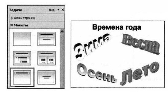 1. Запустите программу OpenOffice.org Impress. Создайте пустую презентацию. 2. На панели задач (устанавливается командой Вид — Панель задач) на вкладке Макеты щелчком выберите макет Только заголовок. В поле для заголовка слайда введите текст «Времена года». 3. С помощью инструмента Галерея текстовых эффектов создайте четыре красочные надписи «Зима», «Весна», «Лето», «Осень».