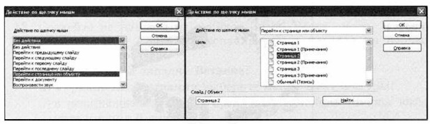 4. Аналогичным образом создайте слайды «Весна», «Лето» и «Осень». 5. Перейдите на первый слайд. Необходимо связать надпись «Зима» с соответствующим слайдом, иначе говоря, создать гиперссылку. Выделите надпись «Зима» и выполните команду Демонстрация — Действие по щелчку мыши. На вкладке Действие по щелчку мыши выберите пункт Перейти к странице или объекту и нажмите кнопку ОК. В раскрывающемся списке укажите цель Страница 2 и нажмите кнопку ОК.
