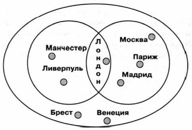 Перечислите города-объекты, являющиеся элементами пред ставленных на рисунке множеств.