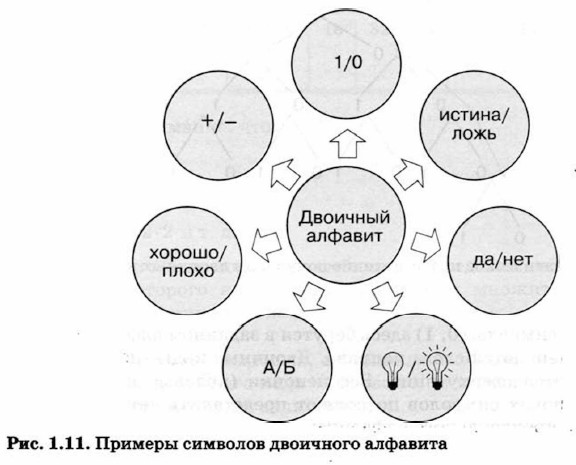 Алфавит, содержащий два символа, называется двоичным алфавитом (рис. 1.11). Представление информации с помощью двоичного алфавита называют двоичным кодированием. Закодировав таким способом информацию, мы получим её двоичный код.