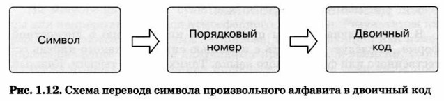 Рассмотрим в качестве символов двоичного алфавита цифры 0 и 1. Покажем, что любой алфавит можно заменить двоичным алфавитом. Прежде всего, присвоим каждому символу рассматриваемого алфавита порядковый номер. Номер представим с помощью двоичного алфавита. Полученный двоичный код будем считать кодом исходного символа (рис. 1.12).