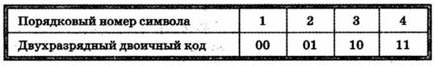 Двоичные символы (0,1) здесь берутся в заданном алфавитном порядке и размещаются слева направо. Двоичные коды (цепочки символов) читаются сверху вниз. Все цепочки (кодовые комбинации) из двух двоичных символов позволяют представить четыре различных символа произвольного алфавита: