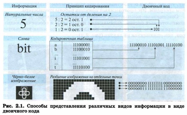 Универсальным устройством компьютер называется потому, что он может применяться для многих целей — обрабатывать, хранить и передавать самую разнообразную информацию, использоваться человеком в разных видах деятельности. Современные компьютеры могут обрабатывать разные виды информации: числа, текст, изображения, звуки. Информация любого вида представляется в компьютере в виде двоичного кода — последовательностей нулей и единиц. Некоторые способы двоичного кодирования представлены на рис. 2.1.