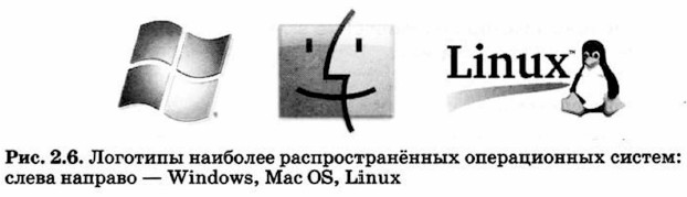 Компьютер — сложная система, состоящая из множества аппаратных (физических) и программных (информационных) объектов. К физическим объектам относятся устройства памяти, монитор, клавиатура, принтеры и др.; к информационным объектам относятся всевозможные программы и данные. ИнтерфейсВ свою очередь, компьютер является частью системы «человек — компьютер». Средства, обеспечивающие взаимосвязь между объектами этой системы, называют интерфейсом. Аппаратный интерфейсАппаратный интерфейс — средства, обеспечивающие взаимодействие между устройствами компьютера. Для обеспечения совместного функционирования аппаратного обеспечения компьютера в состав ОС входят драйверы устройств — специальные программы, управляющие работой подключённых к компьютеру устройств (клавиатуры, мыши, монитора, принтера и т. д.). Каждому устройству соответствует свой драйвер, поставляемый производителем этого оборудования. Пользовательский интерфейсПользовательский интерфейс — средства, обеспечивающие взаимодействие человека и компьютера. В операционную систему входят программы, поддерживающие диалог пользователя с компьютером: желая произвести некоторое действие (запустить программу на выполнение, распечатать текст на принтере, посмотреть свойства компьютера и т. д.), человек даёт ОС соответствующую команду. Операционная система выполняет эту команду и предоставляет пользователю результат работы или же сообщает о невозможности выполнения заданной команды. Чуть позже мы рассмотрим пользовательский интерфейс более подробно. В настоящее время наиболее распространёнными ОС для персональных компьютеров являются Windows, MacOS и Linux (рис. 2.6).