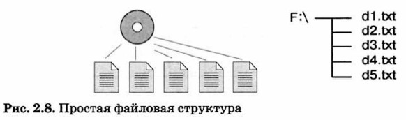 Файловые структуры бывают простыми и многоуровневыми (иерархическими). Простые файловые структуры могут использоваться для дисков с небольшим (до нескольких десятков) количеством файлов. В этом случае оглавление диска представляет собой линейную последовательность имён файлов (рис. 2.8). Его можно сравнить с оглавлением детской книжки, которое содержит названия входящих в неё рассказов и номера страниц.