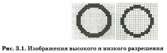 Изображение на экране монитора формируется из отдельных точек — пикселей (англ, picture element — элемент изображения), образующих строки; всё изображение состоит из определённого количества таких строк. Пространственное разрешение монитора — это количество пикселей, из которых складывается изображение на его экране. Оно определяется как произведение количества строк изображения на количество точек в строке. Мониторы могут отображать информацию с различными пространственными разрешениями (800 х 600, 1280 х 1024, 1400 х 1050 и выше). Например, разрешение монитора 1280 х 1024 означает, что изображение на его экране будет состоять из 1024 строк, каждая из которых содержит 1280 пикселей. Изображение высокого разрешения состоит из большого количества мелких точек и имеет хорошую чёткость. Изображение низкого разрешения состоит из меньшего количества более крупных точек и может быть недостаточно чётким (рис. 3.1).