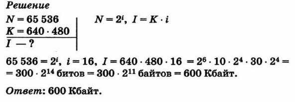 Задача. Рассчитайте объём видеопамяти, необходимой для хранения графического изображения, занимающего весь экран монитора с разрешением 640 х 480 и палитрой из 65 536 цветов.