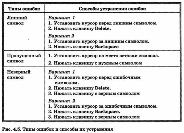 § 4.2. Создание текстовых документов на компьютере Редактирование текста на компьютере (окончание)Более мощные текстовые процессоры не только находят слова в словаре, но и различают словоформы, анализируют грамматическую структуру предложений. Такие программы подсказывают пользователю расстановку знаков препинания, помогают правильно построить фразу. Всё многообразие ошибок, допускаемых при вводе текста, может быть сведено к трём типам: лишний символ, пропущенный символ и ошибочный символ. Способы устранения этих ошибок описаны на рис. 4.5.1 1 Предполагается, что установлен режим вставки.