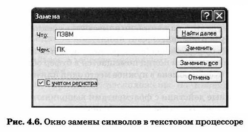 Для того чтобы найти все ошибки, необходимо понимать смысл слов автора. Это компьютеру не по силам. Вот почему для современного человека так важны грамотность и хорошее знание родного языка. Что касается возможностей компьютера, то их следует использовать для избавления человека от утомительной однообразной работы. Например, если необходимо в большом тексте заменить аббревиатуру «ПЭВМ» на «ПК», то лучше всего воспользоваться имеющейся в текстовых процессорах функцией поиска и замены (рис. 4.6).