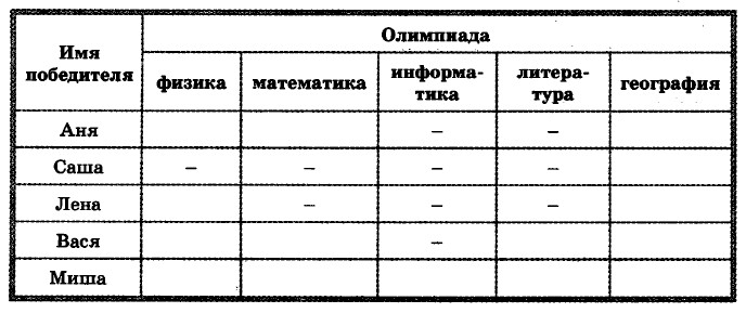 Победителем какой олимпиады стал каждый из этих ребят? Решение. Задачи такого типа решаются с помощью логических рассуждений, которые удобно фиксировать в таблице. Ниже представлена таблица, в которой отражена информация о победителях олимпиад, содержащаяся в условии задачи. Например, из п. 1 можно сделать вывод, что ни Аня, ни Саша не являются победителями олимпиады по информатике. Это отражено в таблице знаками «—» в ячейках на пересечении строк и столбцов с соответствующими именами школьников и названиями олимпиад.