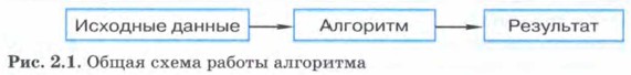 § 2.1. Алгоритмы и исполнители 2.1.1. Понятие алгоритма (окончание)Алгоритм может представлять собой описание некоторой последовательности вычислений (пример 1) или шагов нематематического характера (примеры 2-3). Но в любом случае перед его разработкой должны быть чётко определены начальные условия (исходные данные) и то, что предстоит получить (результат). Можно сказать, что алгоритм — это описание последовательности шагов в решении задачи, приводящих от исходных данных к требуемому результату. В общем виде схему работы алгоритма можно представить следующим образом (рис. 2.1).