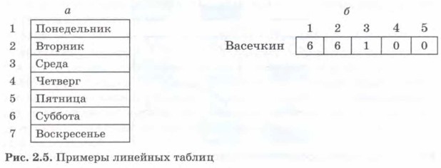 § 2.3. Объекты алгоритмов 2.3.4.Табличные величины. Объекты алгоритмовВ практической деятельности человек часто использует всевозможные таблицы. Это, например, список учащихся в классном журнале, табель успеваемости, таблица результатов спортивных соревнований и т. д. Чаще всего встречаются линейные и прямоугольные таблицы. Линейная таблицаЛинейная таблица (одномерный массив) представляет собой набор однотипных данных, записанных в одну строку или один столбец. Элементы строки (столбца) всегда нумеруются. Например, с помощью линейной таблицы могут быть представлены дни недели (рис. 2.5, а) или количество уроков, пропущенных учеником в течение 5-дневной учебной недели (рис. 2.5, б).