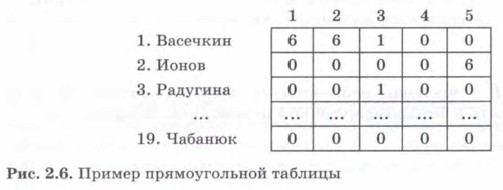 Прямоугольная таблицаПрямоугольная таблица (двумерный массив) — это упорядоченный некоторым образом набор строк (столбцов), содержащих одинаковое количество элементов. Строки прямоугольных таблиц имеют свою нумерацию, столбцы — свою. Например, с помощью прямоугольной таблицы можно представить количество уроков, пропущенных всеми учениками 8 класса в течение 5-дневной учебной недели (рис. 2.6).