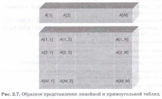 Всей совокупности элементов табличной величины даётся одно имя. Элементы различают по их номерам, называемым индексами. Индекс записывается в квадратных скобках сразу за именем таблицы. Если первую из рассмотренных нами таблиц (см. рис. 2.5, а) назвать WEEK, то WEEK[1] = 'понедельник', WEEK[6] = 'суббота'. Назовём третью из рассмотренных таблиц LES. Тогда LES[1,1] = 6, LES[2,5] = 6, LES[3,4] = 0. Образно линейная и прямоугольная таблицы показаны на рис. 2.7.