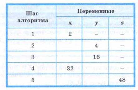 Выясним, какое значение получит переменная s после выполнения этого фрагмента алгоритма. Для этого составим таблицу значений переменных, задействованных в алгоритме: