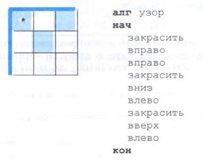 Пример 2. У исполнителя Робот есть четыре команды перемещения (вверх, вниз, влево и вправо), при выполнении каждой из них Робот перемещается на одну клетку в соответствующем направлении. По команде закрасить Робот закрашивает клетку, в которой он находится. Запишем линейный алгоритм, исполняя который Робот нарисует на клетчатом поле следующий узор и вернётся в исходное положение, обозначенное звёздочкой: