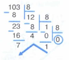 § 1.1. Системы счисления 1.1.3. Восьмеричная система счисленияВосьмеричной системой счисления называется позиционная система счисления с основанием 8. Для записи чисел в восьмеричной системе счисления используются цифры: 0, 1,2, 3, 4, 5, 6, 7. На основании формулы (1) для целого восьмеричного числа можно записать: аn-1аn-2...а1а0 = аn-1 • 8n-1 + аn-2 • 8n-2 + ... + а0 • 80. (1") Например: 10638 = 1 • 83 + 0 • 82 + 6 • 81 + 3 • 80 = 56310. Таким образом, для перевода целого восьмеричного числа в десятичную систему счисления следует перейти к его развёрнутой записи и вычислить значение получившегося выражения. Для перевода целого десятичного числа в восьмеричную систему счисления следует последовательно выполнять деление данного числа и получаемых целых частных на 8 до тех пор, пока не получим частное, равное нулю. Исходное число в новой системе счисления составляется последовательной записью полученных остатков, начиная с последнего.