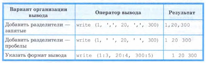 Если значение переменной s равно 15 и она имеет целочисленный тип, то на экране появится: s=15 Если значение переменной s равно 15, но она имеет вещественный тип, то на экране появится: s=1. 5Е+01 При выполнении оператора вывода все элементы списка вывода печатаются непосредственно друг за другом. Так, в результате работы оператора write (1, 20, 300) на экран будет выведена последовательность цифр 120300, которая будет восприниматься нами как число 120300, а не как три отдельные числовые константы. Сделать выводимые данные более доступными для восприятия можно разными способами: