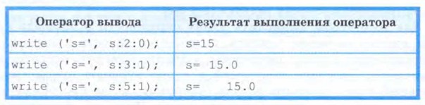 Формат вывода — это указываемое после двоеточия целое число, определяющее, сколько позиций на экране должна занимать выводимая величина. Если цифр в числе меньше, чем зарезервированных под него позиций на экране, то свободные позиции дополняются пробелами слева от числа. Если указанное в формате вывода после двоеточия число меньше, чем необходимо, то оно автоматически будет увеличено до минимально необходимого. Для вывода вещественного числа в формате с фиксированной запятой в списке вывода для каждого выражения указываются два параметра: 1) общее количество позиций, отводимых под число; 2) количество позиций в дробной части числа: