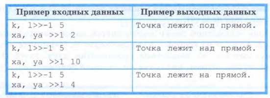 10. Напишите программу, определяющую, лежит ли точка А(ха, уа) на прямой у =kx + l, на ней или под ней.