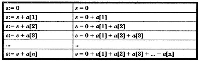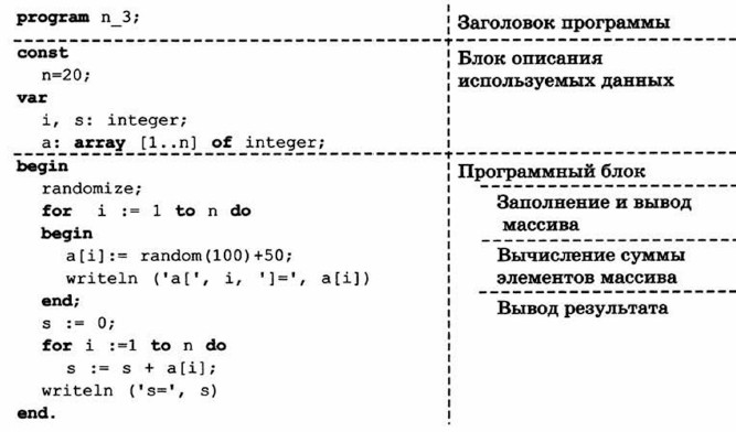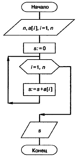 Суммирование элементов массива осуществляется по тому же принципу, что и суммирование значений простых переменных: за счёт поочерёдного добавления слагаемых: 1) определяется ячейка памяти (переменная а), в которой будет последовательно накапливаться результат суммирования; 2) переменной s присваивается начальное значение 0 — число, не влияющее на результат сложения; 3) для каждого элемента массива из переменной s считывается её текущее значение и складывается со значением элемента массива; полученный результат присваивается переменной а. Описанный процесс наглядно можно изобразить так: