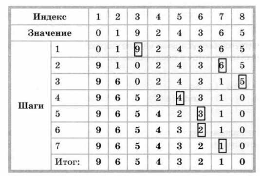 Рассмотрим процесс сортировки выбором на примере массива а = {0, 1, 9, 2, 4, 3, 6, 5}.