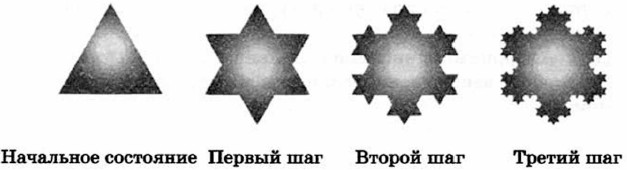 Пример 5. Рассмотрим алгоритм построения геометрической фигуры, которая называется снежинкой Коха. Шаг процедуры построения состоит в замене средней трети каждого из имеющихся отрезков двумя новыми такой же длины, как показано на рисунке: