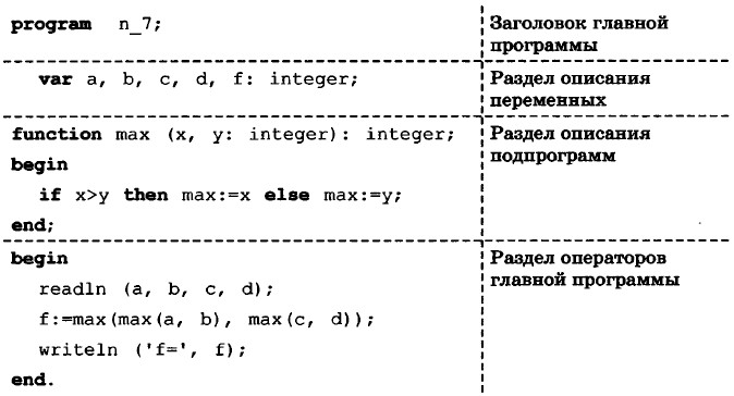В заголовке функции после её имени приводится описание входных данных — указывается перечень формальных параметров и их типов. Там же указывается тип самой функции, т. е. тип результата. Функция — подпрограмма, имеющая единственный результат, записываемый в ячейку памяти, имя которой совпадает с именем функции. Поэтому в блоке функции обязательно должен присутствовать оператор <имя_функции>:=<результат>. Для вызова функции достаточно указать её имя со списком фактических параметров в любом выражении, в условиях (после слов if, while, until) или в операторе write главной программы.