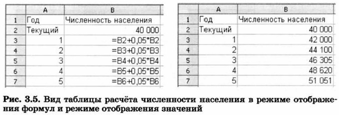 Внесём в таблицу исходные данные, в ячейку ВЗ введём формулу = В2+0,05*В2 с относительными ссылками; скопируем формулу из ячейки ВЗ в диапазон ячеек В4:В7 (рис. 3.5).